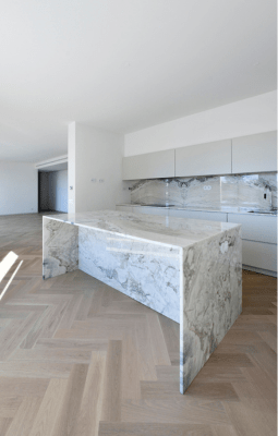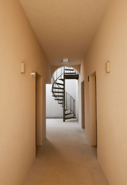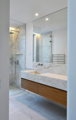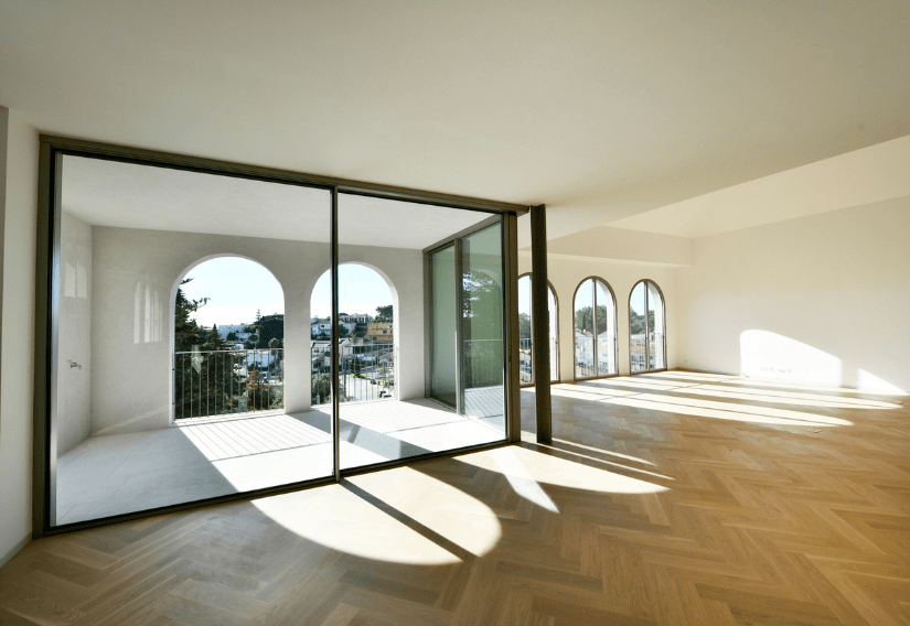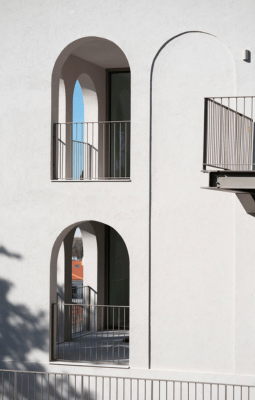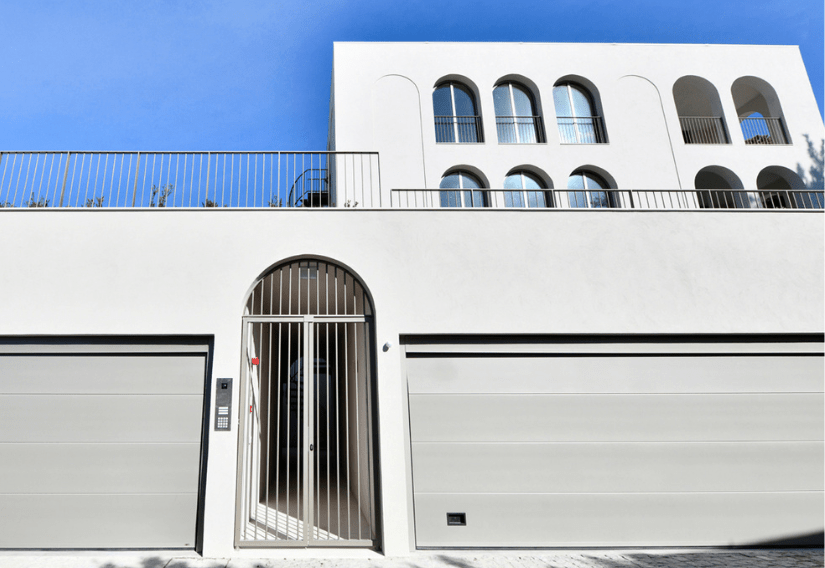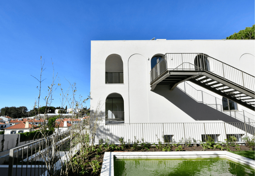 Condomínio de luxo com três apartamentos, cada um deles com garagem e piscina, integrados num jardim comum.