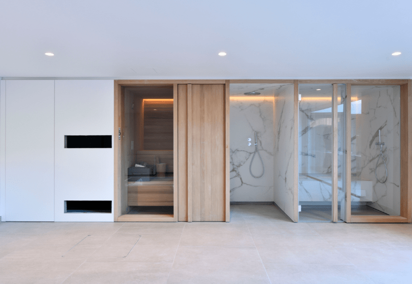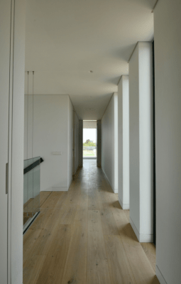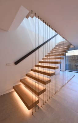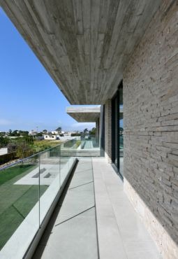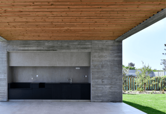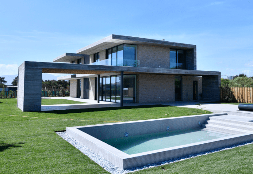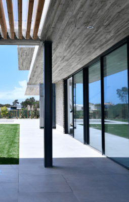 Amplas superfícies envidraçadas e espaços exteriores que incluem jardim, piscina e pérgolas de sombreamento, proporcionando uma experiência arquitetônica contemporânea e integrada com a natureza.
